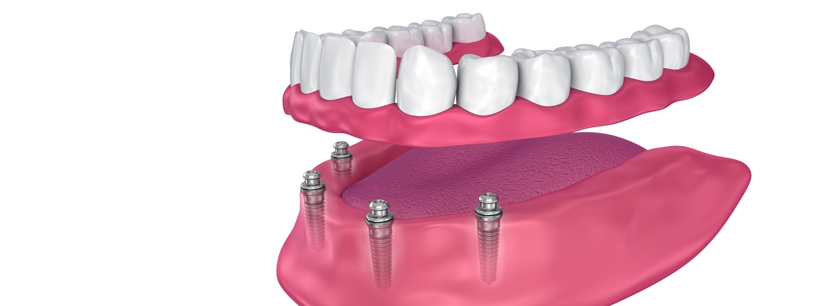As the name suggests, an implant-supported overdenture is supported by dental implants. The overdenture simply snaps onto implants surgically placed in the front of the jawbone, as indicated in the image below.