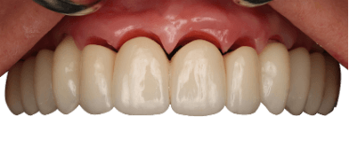 A gum set ceramic prosthesis is the most biologically conservative, aesthetic and truly advanced implant prosthesis currently available. The gum set ceramic prosthesis is different to the other implant bridges because it preserves all of your bone and even tooth roots under the gum. This way, there is no risk of bone shrinkage which keeps optimal lip support and reduces complications commonly associated with procedures such as All on four such as food packing and loss of lip contour. Gum set ceramic prosthetics are not suitable for all patients. A careful degree of assessment to determine a patients suitability is required before proceeding wit Gum set Ceramic prosthetics. Made from ceramic due to its superior physical properties compared to acrylic, it is secured to the natural contours of the patient’s gum using dental implants. This bridge represents the most advanced solution for missing teeth, utilising cutting-edge technology for full arch rehabilitation. Ceramic ensures durability and a natural look, offering the best available option for implant-supported dental solutions.
